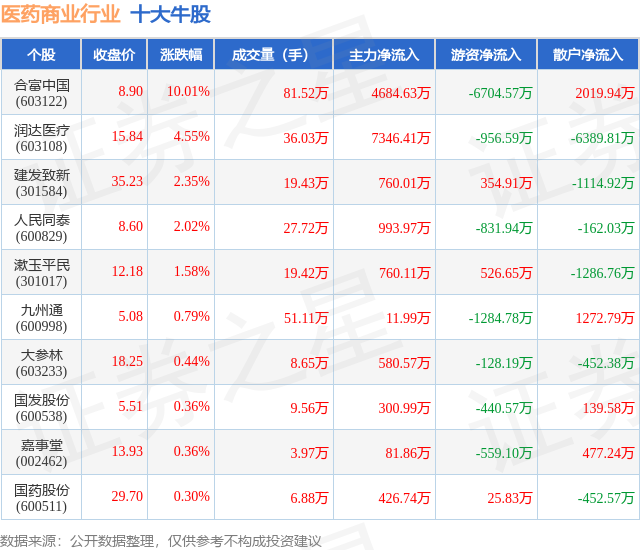 个股表现方面,医药商业行业当日领涨股为合富中国(603122),该股当日报收8.9,上涨10.01%,成交量81.52万,主力资金净流入4684.63万元。润达医疗(603108)以上涨4.55%紧随其后,该股当日成交量36.03万,主力资金净流入7346.41万元。除此之外,建发致新(301584)、人民同泰(600829)、漱玉平民(301017)均进入当日牛股之列。具体个股列表见下表: