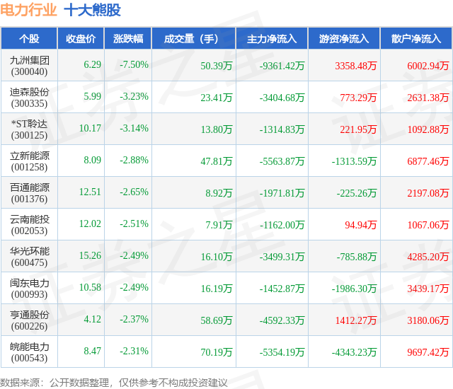个股表现方面,电力行业当日领跌股为九洲集团(300040),该股当日报收6.29,下跌7.5%,成交量50.39万,主力资金净流出9361.42万元。迪森股份(300335)以下跌3.23%紧随其后,该股当日成交量23.41万,主力资金净流出3404.68万元。除此之外,*ST聆达(300125)、立新能源(001258)、百通能源(001376)均进入当日熊股之列。具体个股列表见下表: