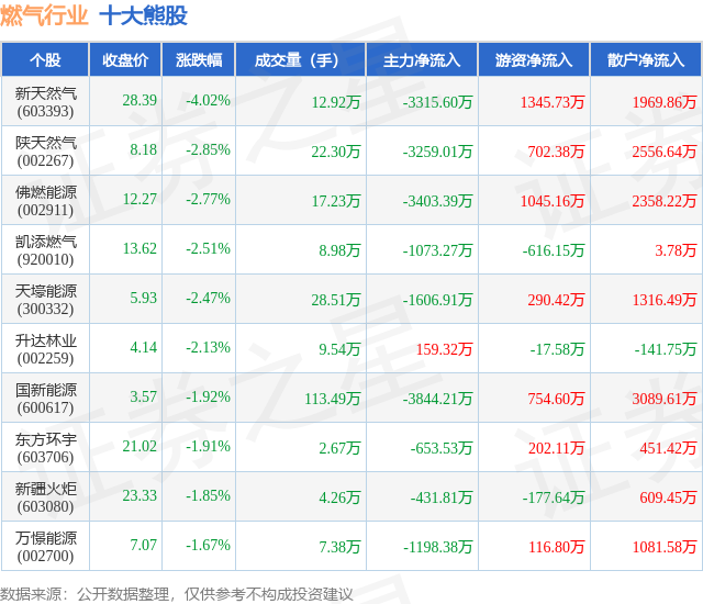 个股表现方面,燃气行业当日领跌股为新天然气(603393),该股当日报收28.39,下跌4.02%,成交量12.92万,主力资金净流出3315.6万元。陕天然气(002267)以下跌2.85%紧随其后,该股当日成交量22.3万,主力资金净流出3259.01万元。除此之外,佛燃能源(002911)、凯添燃气(920010)、天壕能源(300332)均进入当日熊股之列。具体个股列表见下表: