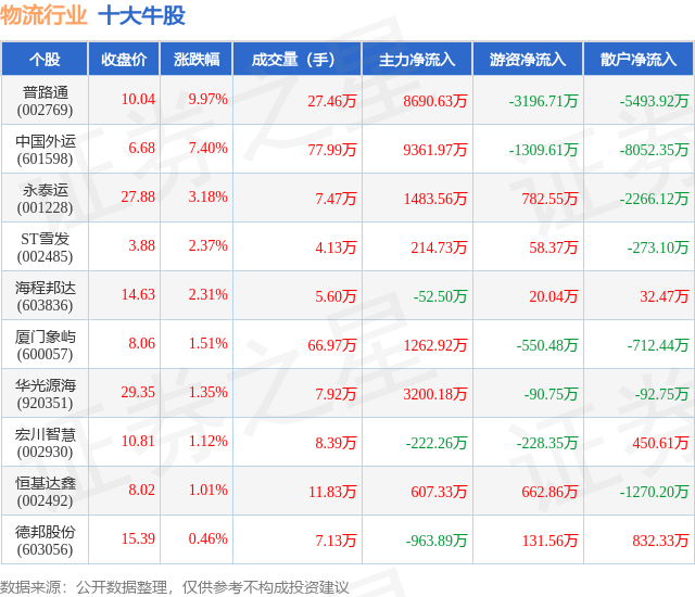个股表现方面,物流行业当日领涨股为普路通(002769),该股当日报收10.04,上涨9.97%,成交量27.46万,主力资金净流入8690.63万元。中国外运(601598)以上涨7.4%紧随其后,该股当日成交量77.99万,主力资金净流入9361.97万元。除此之外,永泰运(001228)、ST雪发(002485)、海程邦达(603836)均进入当日牛股之列。具体个股列表见下表: