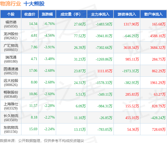 个股表现方面,物流行业当日领跌股为福然德(605050),该股当日报收14.34,下跌6.76%,成交量27.6万,主力资金净流出1483.58万元。龙洲股份(002682)以下跌4.56%紧随其后,该股当日成交量77.52万,主力资金净流出3941.81万元。除此之外,广汇物流(600603)、瑞茂通(600180)、圆通速递(600233)均进入当日熊股之列。具体个股列表见下表: