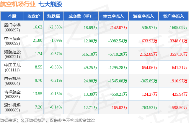 个股表现方面,航空机场行业当日领跌股为厦门空港(600897),该股当日报收16.62,下跌2.35%,成交量18.69万,主力资金净流入2142.07万元。中信海直(000099)以下跌1.09%紧随其后,该股当日成交量12.0万,主力资金净流出3982.54万元。除此之外,海航控股(600221)、中国国航(601111)、白云机场(600004)均进入当日熊股之列。具体个股列表见下表: