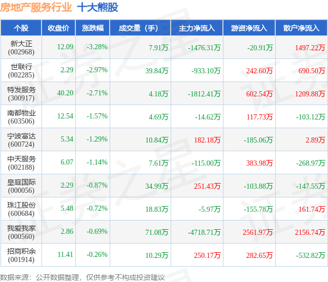 个股表现方面,房地产服务行业当日领跌股为新大正(002968),该股当日报收12.09,下跌3.28%,成交量7.91万,主力资金净流出1476.31万元。世联行(002285)以下跌2.97%紧随其后,该股当日成交量39.84万,主力资金净流出933.1万元。除此之外,特发服务(300917)、南都物业(603506)、宁波富达(600724)均进入当日熊股之列。具体个股列表见下表: