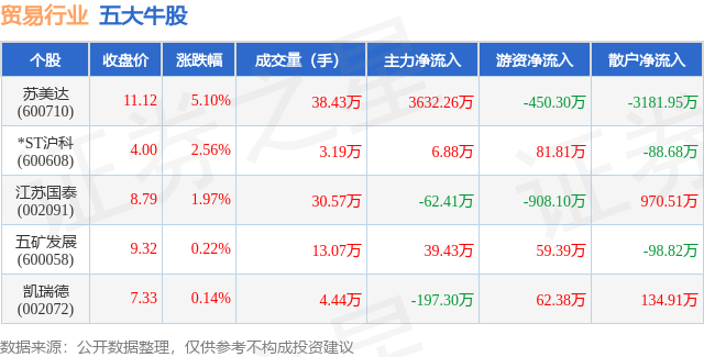 个股表现方面,贸易行业当日领涨股为苏美达(600710),该股当日报收11.12,上涨5.1%,成交量38.43万,主力资金净流入3632.26万元。*ST沪科(600608)以上涨2.56%紧随其后,该股当日成交量3.19万,主力资金净流入6.88万元。除此之外,江苏国泰(002091)、五矿发展(600058)、凯瑞德(002072)均进入当日牛股之列。具体个股列表见下表:
