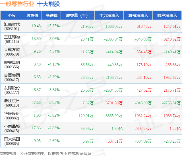 个股表现方面,一般零售行业当日领跌股为汇嘉时代(603101),该股当日报收10.43,下跌5.35%,成交量21.98万,主力资金净流出1866.08万元。三江购物(601116)以下跌5.06%紧随其后,该股当日成交量23.41万,主力资金净流出2895.04万元。除此之外,大连友谊(000679)、赫美集团(002356)、合百集团(000417)均进入当日熊股之列。具体个股列表见下表: