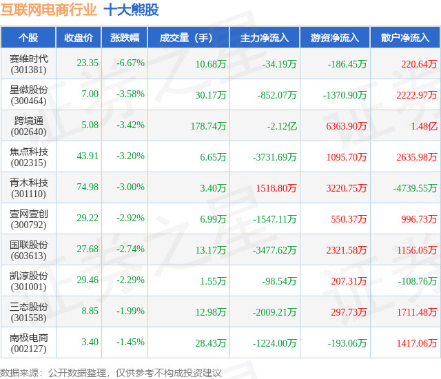 个股表现方面,互联网电商行业当日领跌股为赛维时代(301381),该股当日报收23.35,下跌6.67%,成交量10.68万,主力资金净流出34.19万元。星徽股份(300464)以下跌3.58%紧随其后,该股当日成交量30.17万,主力资金净流出852.07万元。除此之外,跨境通(002640)、焦点科技(002315)、青木科技(301110)均进入当日熊股之列。具体个股列表见下表: