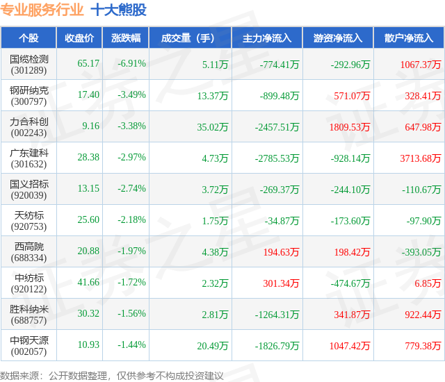个股表现方面,专业服务行业当日领跌股为国缆检测(301289),该股当日报收65.17,下跌6.91%,成交量5.11万,主力资金净流出774.41万元。钢研纳克(300797)以下跌3.49%紧随其后,该股当日成交量13.37万,主力资金净流出899.48万元。除此之外,力合科创(002243)、广东建科(301632)、国义招标(920039)均进入当日熊股之列。具体个股列表见下表: