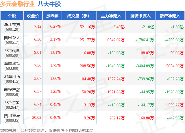 个股表现方面,多元金融行业当日领涨股为浙江东方(600120),该股当日报收7.12,上涨6.27%,成交量521.16万,主力资金净流入3.49亿元。国网英大(600517)以上涨3.17%紧随其后,该股当日成交量251.77万,主力资金净流入6542.02万元。除此之外,*ST熊猫(600599)、海南华铁(603300)、渤海租赁(000415)均进入当日牛股之列。具体个股列表见下表: