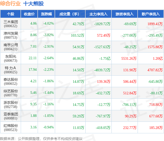 个股表现方面,综合行业当日领跌股为三木集团(000632),该股当日报收4.06,下跌4.02%,成交量42.79万,主力资金净流出1829.72万元。漳州发展(000753)以下跌3.82%紧随其后,该股当日成交量103.52万,主力资金净流入572.49万元。除此之外,南京公用(000421)、东阳光(600673)、特 力A(000025)均进入当日熊股之列。具体个股列表见下表: