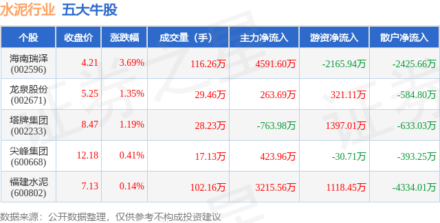 个股表现方面,水泥行业当日领涨股为海南瑞泽(002596),该股当日报收4.21,上涨3.69%,成交量116.26万,主力资金净流入4591.6万元。龙泉股份(002671)以上涨1.35%紧随其后,该股当日成交量29.46万,主力资金净流入263.69万元。除此之外,塔牌集团(002233)、尖峰集团(600668)、福建水泥(600802)均进入当日牛股之列。具体个股列表见下表: