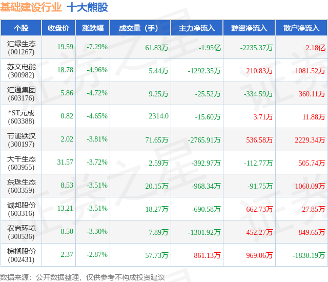 个股表现方面,基础建设行业当日领跌股为汇绿生态(001267),该股当日报收19.59,下跌7.29%,成交量61.83万,主力资金净流出1.95亿元。苏文电能(300982)以下跌4.96%紧随其后,该股当日成交量5.44万,主力资金净流出1292.35万元。除此之外,汇通集团(603176)、*ST元成(603388)、节能铁汉(300197)均进入当日熊股之列。具体个股列表见下表: