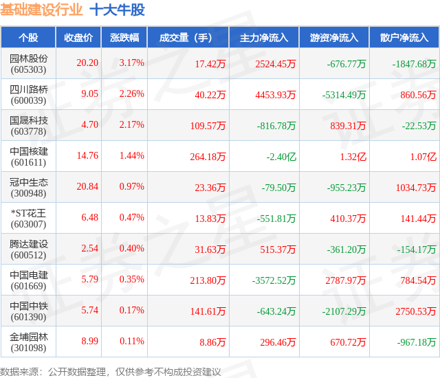 个股表现方面,基础建设行业当日领涨股为园林股份(605303),该股当日报收20.2,上涨3.17%,成交量17.42万,主力资金净流入2524.45万元。四川路桥(600039)以上涨2.26%紧随其后,该股当日成交量40.22万,主力资金净流入4453.93万元。除此之外,国晟科技(603778)、中国核建(601611)、冠中生态(300948)均进入当日牛股之列。具体个股列表见下表: