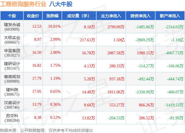 个股表现方面,工程咨询服务行业当日领涨股为建发合诚(603909),该股当日报收12.53,上涨10.01%,成交量8.18万,主力资金净流入3799.09万元。太极实业(600667)以上涨2.99%紧随其后,该股当日成交量217.61万,主力资金净流入1.5亿元。除此之外,华蓝集团(301027)、建研设计(301167)、蕾奥规划(300989)均进入当日牛股之列。具体个股列表见下表:
