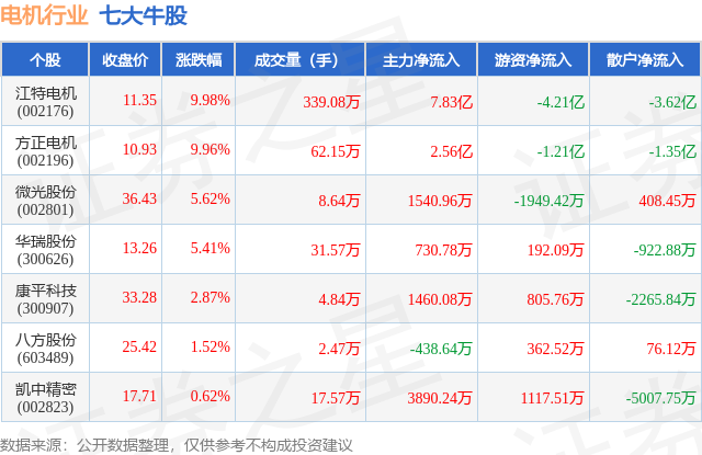 个股表现方面,电机行业当日领涨股为江特电机(002176),该股当日报收11.35,上涨9.98%,成交量339.08万,主力资金净流入7.83亿元。方正电机(002196)以上涨9.96%紧随其后,该股当日成交量62.15万,主力资金净流入2.56亿元。除此之外,微光股份(002801)、华瑞股份(300626)、康平科技(300907)均进入当日牛股之列。具体个股列表见下表:
