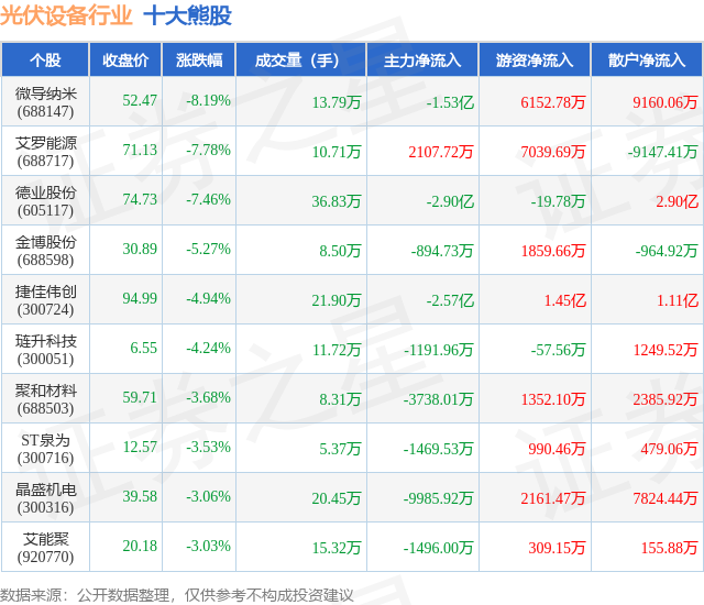 个股表现方面,光伏设备行业当日领跌股为微导纳米(688147),该股当日报收52.47,下跌8.19%,成交量13.79万,主力资金净流出1.53亿元。艾罗能源(688717)以下跌7.78%紧随其后,该股当日成交量10.71万,主力资金净流入2107.72万元。除此之外,德业股份(605117)、金博股份(688598)、捷佳伟创(300724)均进入当日熊股之列。具体个股列表见下表: