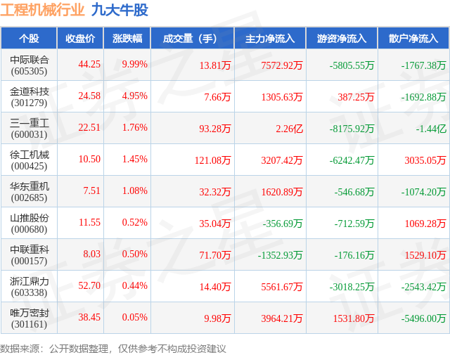 个股表现方面,工程机械行业当日领涨股为中际联合(605305),该股当日报收44.25,上涨9.99%,成交量13.81万,主力资金净流入7572.92万元。金道科技(301279)以上涨4.95%紧随其后,该股当日成交量7.66万,主力资金净流入1305.63万元。除此之外,三一重工(600031)、徐工机械(000425)、华东重机(002685)均进入当日牛股之列。具体个股列表见下表: