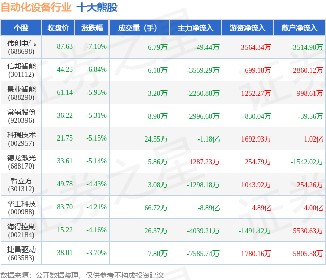个股表现方面,自动化设备行业当日领跌股为伟创电气(688698),该股当日报收87.63,下跌7.1%,成交量6.79万,主力资金净流出49.44万元。信邦智能(301112)以下跌6.84%紧随其后,该股当日成交量6.18万,主力资金净流出3559.29万元。除此之外,景业智能(688290)、常辅股份(920396)、科瑞技术(002957)均进入当日熊股之列。具体个股列表见下表: