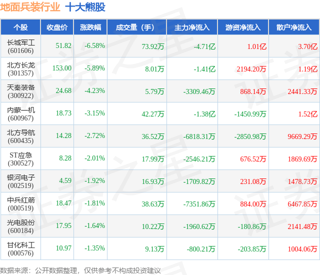 个股表现方面,地面兵装行业当日领跌股为长城军工(601606),该股当日报收51.82,下跌6.58%,成交量73.92万,主力资金净流出4.71亿元。北方长龙(301357)以下跌5.89%紧随其后,该股当日成交量8.01万,主力资金净流出1.41亿元。除此之外,天秦装备(300922)、内蒙一机(600967)、北方导航(600435)均进入当日熊股之列。具体个股列表见下表: