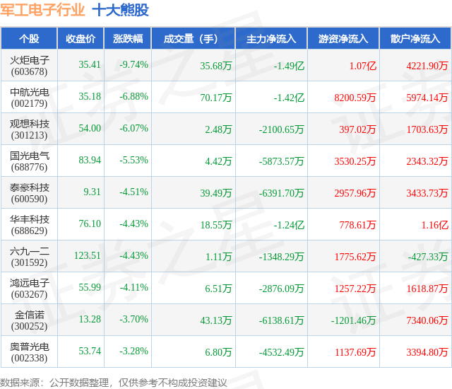 个股表现方面,军工电子行业当日领跌股为火炬电子(603678),该股当日报收35.41,下跌9.74%,成交量35.68万,主力资金净流出1.49亿元。中航光电(002179)以下跌6.88%紧随其后,该股当日成交量70.17万,主力资金净流出1.42亿元。除此之外,观想科技(301213)、国光电气(688776)、泰豪科技(600590)均进入当日熊股之列。具体个股列表见下表: