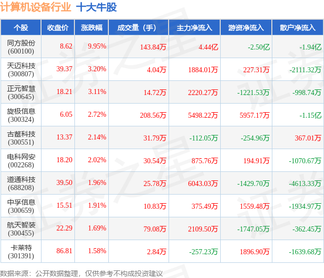 个股表现方面,计算机设备行业当日领涨股为同方股份(600100),该股当日报收8.62,上涨9.95%,成交量143.84万,主力资金净流入4.44亿元。天迈科技(300807)以上涨3.2%紧随其后,该股当日成交量4.04万,主力资金净流入1884.01万元。除此之外,正元智慧(300645)、旋极信息(300324)、古鳌科技(300551)均进入当日牛股之列。具体个股列表见下表: