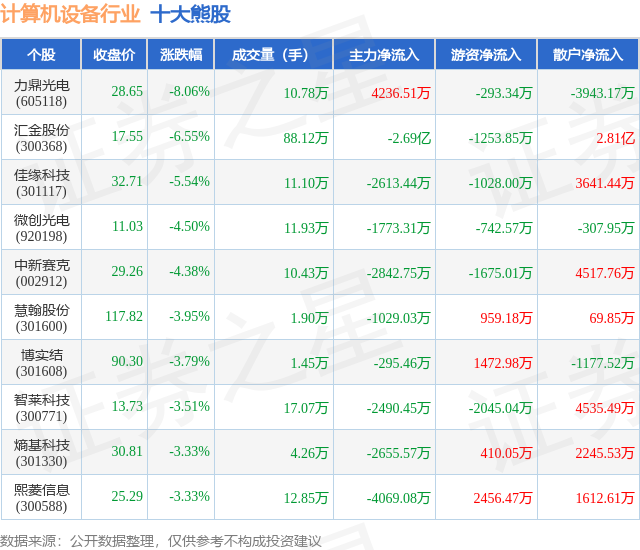 个股表现方面,计算机设备行业当日领跌股为力鼎光电(605118),该股当日报收28.65,下跌8.06%,成交量10.78万,主力资金净流入4236.51万元。汇金股份(300368)以下跌6.55%紧随其后,该股当日成交量88.12万,主力资金净流出2.69亿元。除此之外,佳缘科技(301117)、微创光电(920198)、中新赛克(002912)均进入当日熊股之列。具体个股列表见下表: