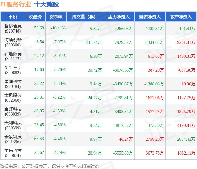 个股表现方面,IT服务行业当日领跌股为路桥信息(920748),该股当日报收58.68,下跌16.41%,成交量5.82万,主力资金净流出4266.93万元。海峡创新(300300)以下跌7.97%紧随其后,该股当日成交量231.74万,主力资金净流出7929.37万元。除此之外,君逸数码(301172)、朗新集团(300682)、国源科技(920184)均进入当日熊股之列。具体个股列表见下表: