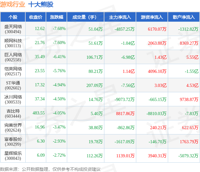 个股表现方面,游戏行业当日领跌股为盛天网络(300494),该股当日报收12.62,下跌7.68%,成交量51.04万,主力资金净流出4857.25万元。顺网科技(300113)以下跌7.6%紧随其后,该股当日成交量51.61万,主力资金净流出1.04亿元。除此之外,巨人网络(002558)、恺英网络(002517)、ST华通(002602)均进入当日熊股之列。具体个股列表见下表: