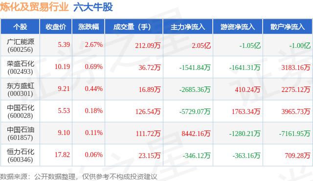 个股表现方面,炼化及贸易行业当日领涨股为广汇能源(600256),该股当日报收5.39,上涨2.67%,成交量212.09万,主力资金净流入2.05亿元。荣盛石化(002493)以上涨0.69%紧随其后,该股当日成交量36.72万,主力资金净流出1541.84万元。除此之外,东方盛虹(000301)、中国石化(600028)、中国石油(601857)均进入当日牛股之列。具体个股列表见下表: