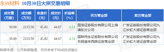 证券之星消息,10月30日永兴材料发生大宗交易,交易数据如下: