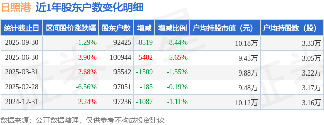 从股价来看,2025年6月30日至2025年9月30日,日照港区间跌幅为1.29%,在此期间股东户数减少8519.0户,减幅为8.44%。