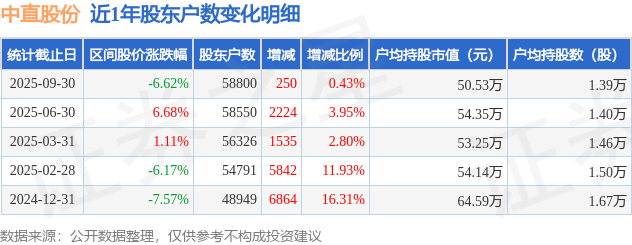 从股价来看,2025年6月30日至2025年9月30日,中直股份区间跌幅为6.62%,在此期间股东户数增加250.0户,增幅为0.43%。