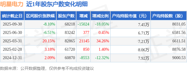 从股价来看,2025年6月30日至2025年9月30日,明星电力区间跌幅为8.1%,在此期间股东户数减少1.5万户,减幅为18.05%。