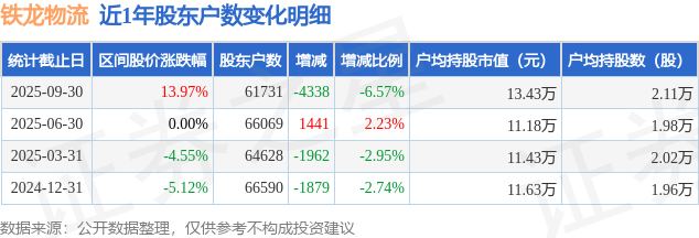 从股价来看,2025年6月30日至2025年9月30日,铁龙物流区间涨幅为13.97%,在此期间股东户数减少4338.0户,减幅为6.57%。