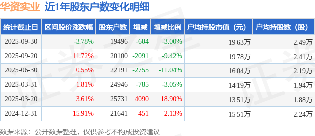 证券之星消息,近日华资实业披露,截至2025年9月30日公司股东户数为1.95万户,较9月20日减少604.0户,减幅为3.0%。户均持股数量由上期的2.41万股增加至2.49万股,户均持股市值为19.63万元。