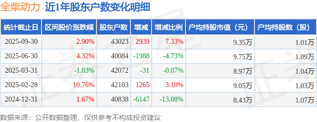 从股价来看,2025年6月30日至2025年9月30日,全柴动力区间涨幅为2.9%,在此期间股东户数增加2939.0户,增幅为7.33%。