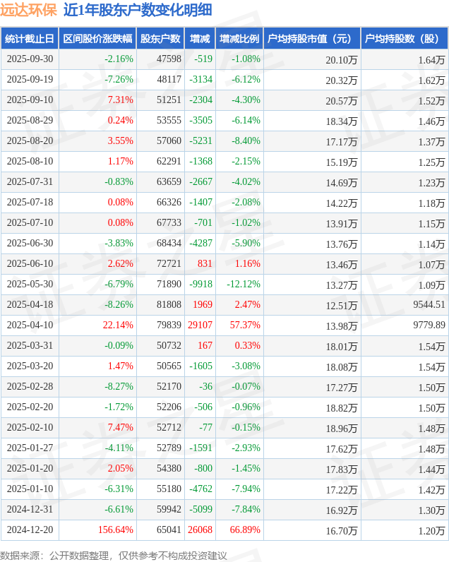 从股价来看,2025年9月19日至2025年9月30日,远达环保区间跌幅为2.16%,在此期间股东户数减少519.0户,减幅为1.08%。