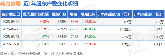 证券之星消息,近日美克家居披露,截至2025年9月30日公司股东户数为3.73万户,较6月30日增加8366.0户,增幅为28.92%。户均持股数量由上期的4.97万股减少至3.85万股,户均持股市值为8.82万元。