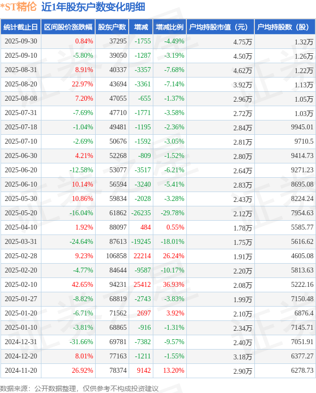 从股价来看,2025年9月10日至2025年9月30日,*ST精伦区间涨幅为0.84%,在此期间股东户数减少1755.0户,减幅为4.49%。