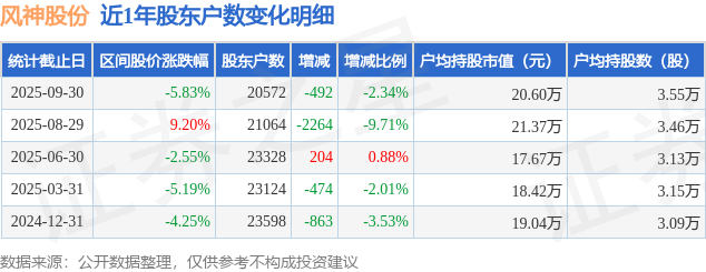 从股价来看,2025年8月29日至2025年9月30日,风神股份区间跌幅为5.83%,在此期间股东户数减少492.0户,减幅为2.34%。