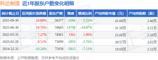 从股价来看,2025年6月30日至2025年9月30日,科达制造区间涨幅为24.8%,在此期间股东户数减少3286.0户,减幅为5.51%。