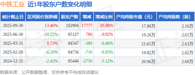 从股价来看,2025年6月30日至2025年9月30日,中铁工业区间涨幅为13.46%,在此期间股东户数增加1.78万户,增幅为20.88%。