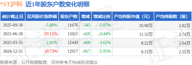 从股价来看,2025年6月30日至2025年9月30日,*ST沪科区间跌幅为5.8%,在此期间股东户数减少345.0户,减幅为2.87%。