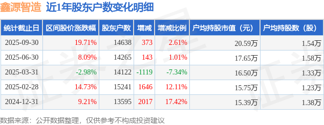 从股价来看,2025年6月30日至2025年9月30日,鑫源智造区间涨幅为19.71%,在此期间股东户数增加373.0户,增幅为2.61%。
