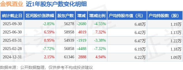 从股价来看,2025年6月30日至2025年9月30日,金枫酒业区间跌幅为2.85%,在此期间股东户数减少2680.0户,减幅为4.55%。