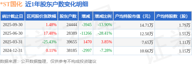 从股价来看,2025年6月30日至2025年9月30日,*ST国化区间涨幅为1.48%,在此期间股东户数减少3945.0户,减幅为13.9%。