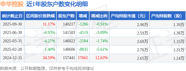 从股价来看,2025年6月30日至2025年9月30日,申华控股区间涨幅为11.17%,在此期间股东户数减少1286.0户,减幅为0.91%。