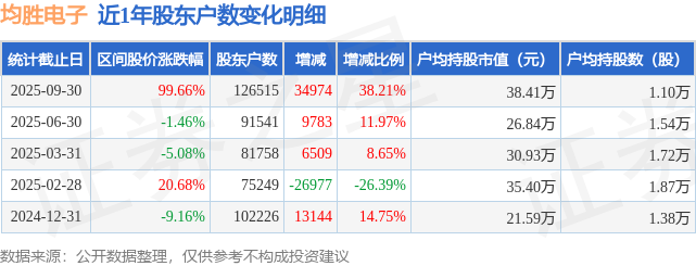 证券之星消息,近日均胜电子披露,截至2025年9月30日公司股东户数为12.65万户,较6月30日增加3.5万户,增幅为38.21%。户均持股数量由上期的1.54万股减少至1.1万股,户均持股市值为38.41万元。