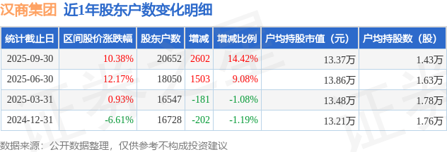 从股价来看,2025年6月30日至2025年9月30日,汉商集团区间涨幅为10.38%,在此期间股东户数增加2602.0户,增幅为14.42%。