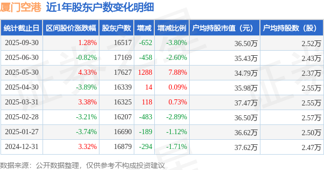 证券之星消息,近日厦门空港披露,截至2025年9月30日公司股东户数为1.65万户,较6月30日减少652.0户,减幅为3.8%。户均持股数量由上期的2.43万股增加至2.52万股,户均持股市值为36.5万元。