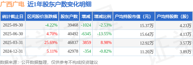 从股价来看,2025年6月30日至2025年9月30日,广西广电区间跌幅为4.22%,在此期间股东户数减少1024.0户,减幅为2.53%。
